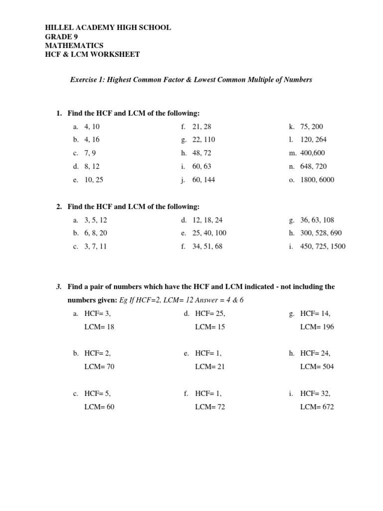 Math worksheets hcf and lcm